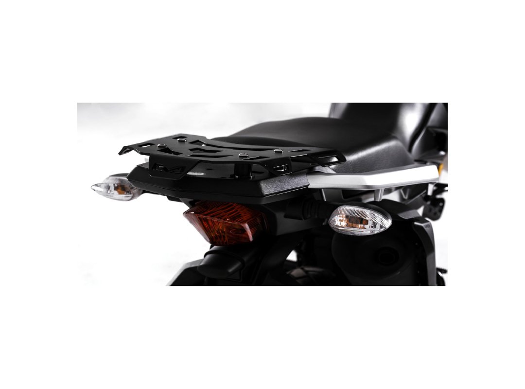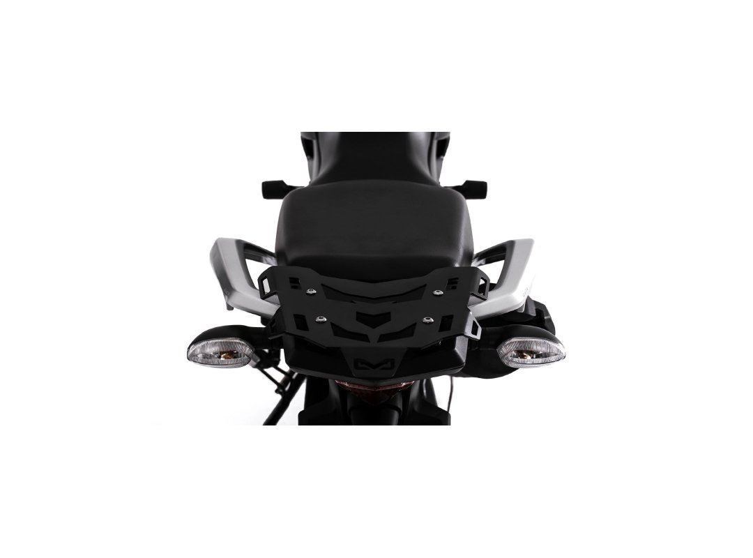 Permite la instalación rápida de baúles o maleteros universales (Givi, Shad, Kappa, entre otros) y cuenta con superficie plana ideal para sujetar equipaje adicional mediante correas o pulpos. No requiere modificaciones para su montaje.